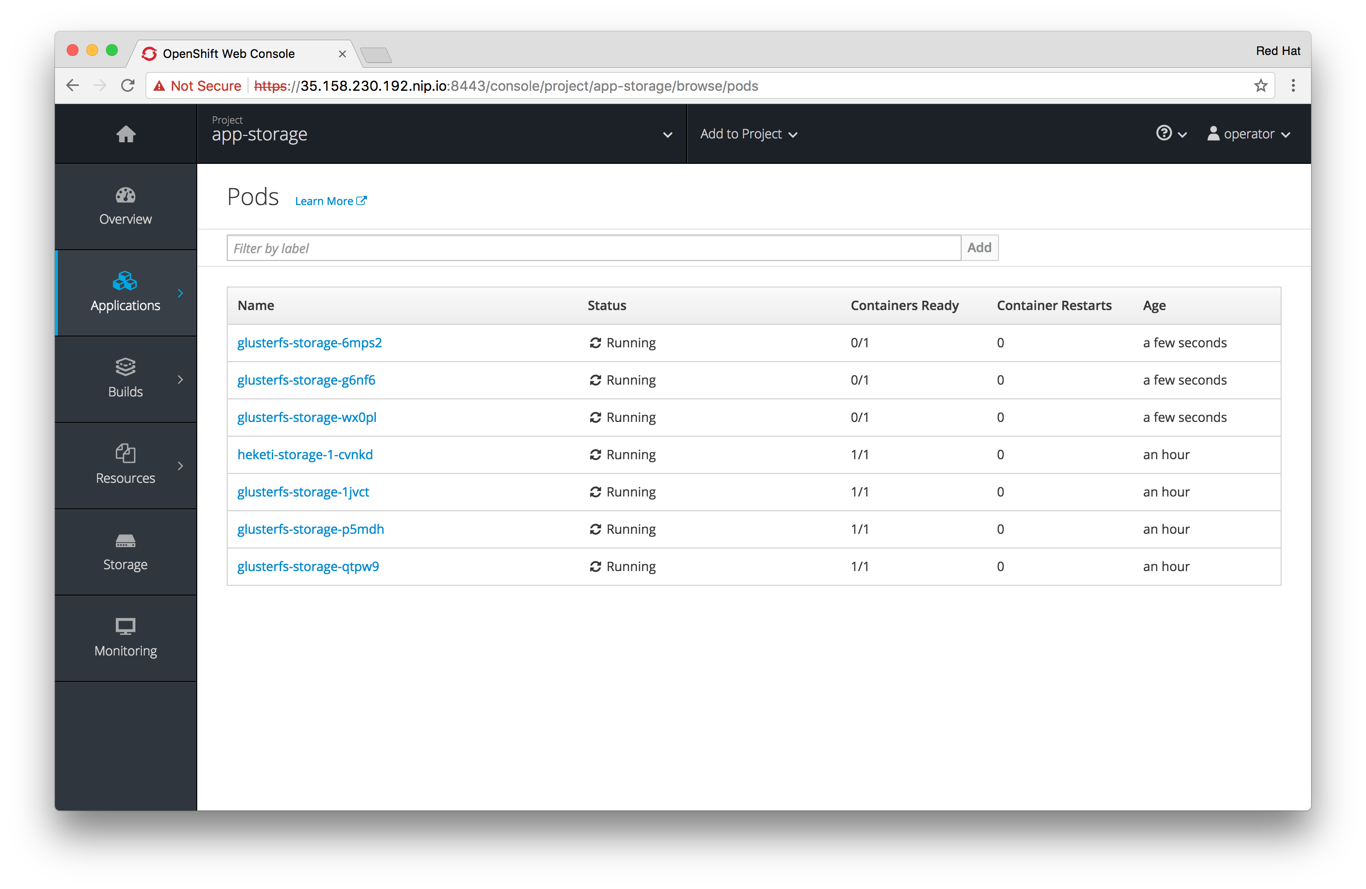 You can also watch the additional GlusterFS pods deploy in the OpenShift UI, while being logged in as operator in project app-storage, select Applications from the left menu and then Pods: